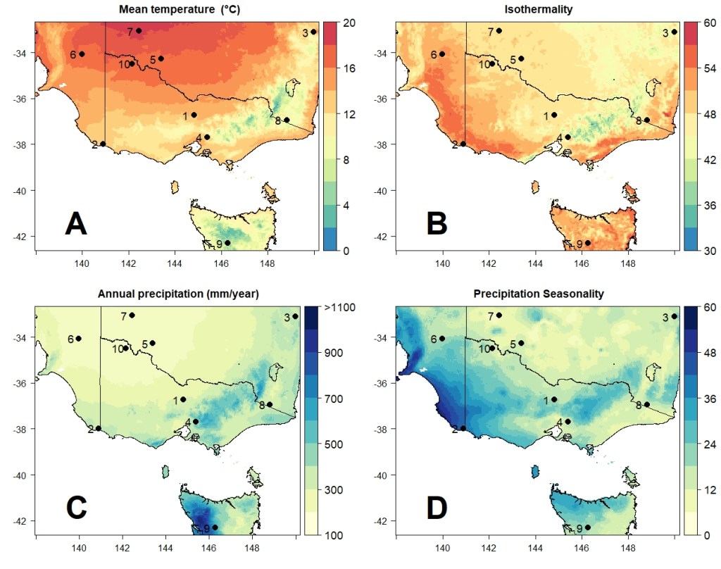For the environmental data, I chose four different environment variables from across southeast Australia, obtained from the CHELSA climatic database. These come from a larger global database of 19 bioclimatic variables related to temperature and precipitation, which are widely used to estimate species distributions and summarise environmental characteristics driving selection. I chose to use annual mean temperature (Bio1), isothermality (Bio3), total annual precipitation (Bio12) and the seasonality of precipitation (Bio15). I decided on this particular region and these particular variables for a few different reasons:
