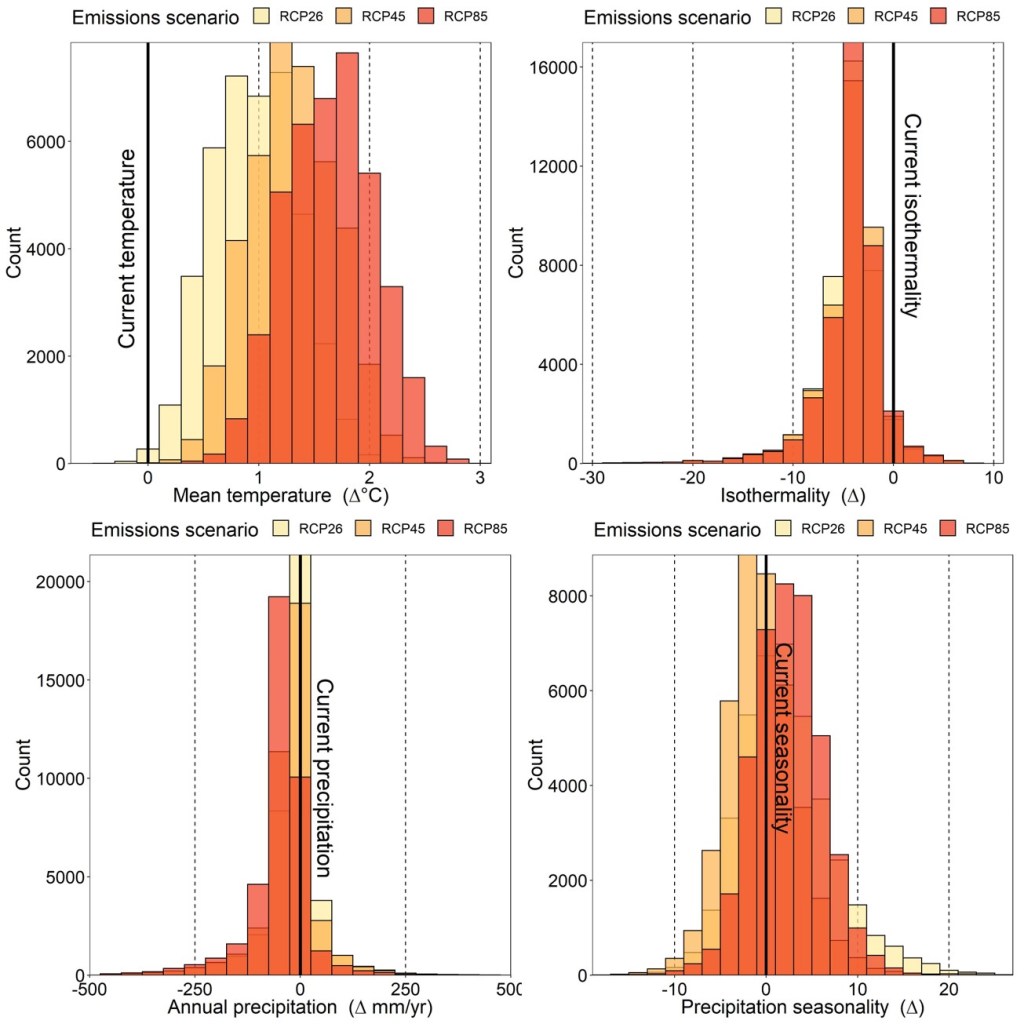 These future scenarios take the form of “shared socio-economic pathways” (SSPs) or “representative concentration pathways” (RCPs), which seek to model possible future climatic conditions depending on how well global carbon emissions are controlled. These pathways range from (relatively) mild to severe, and have their own timelines of global climatic change. To represent the range of potential future climates, I obtained the same four environmental variables as above projected under relatively mild (RCP2.6), moderate (RCP4.5) and severe (RCP8.5) climate change using data freely available in the CHELSA database.