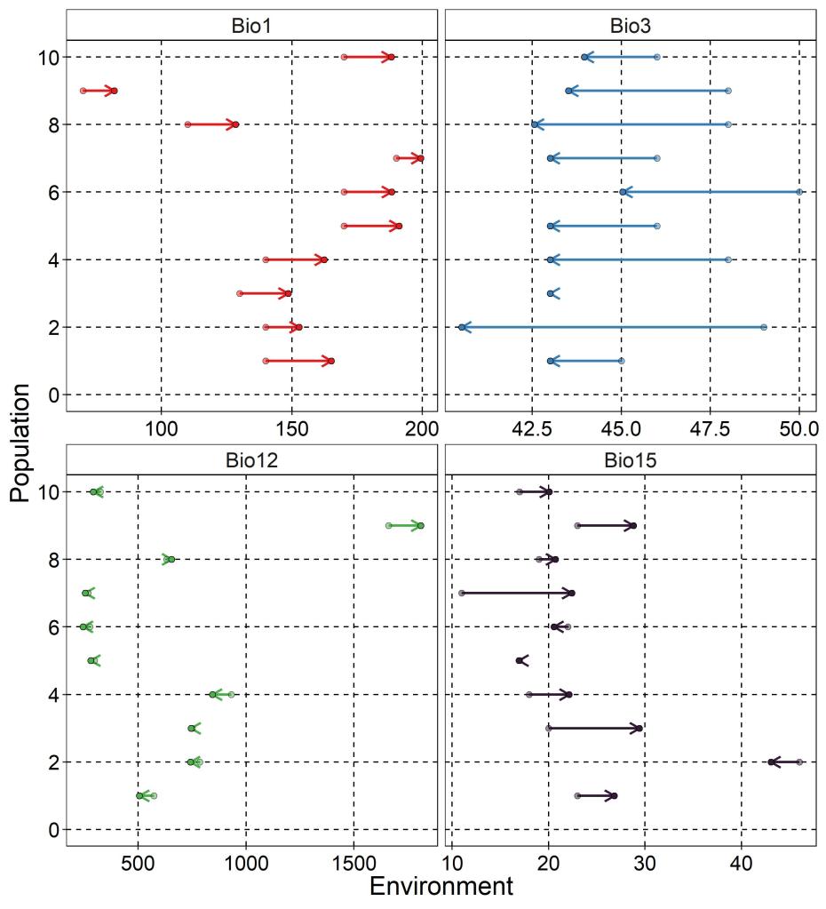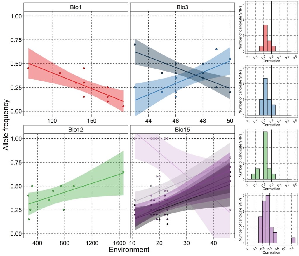 Within the most strongly associated SNPs, it appears that many of them are associated with precipitation seasonality (Bio15), although this might be due to the fact that most populations cluster at either low or high values (i.e. the full range of seasonality is not well sampled across the populations).