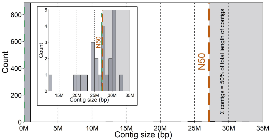 One of the most commonly used measures of genome assembly quality is called the N50 statistic. The N50 of an assembly is the length of the smallest contig above which the combined contigs contain 50% of the total length of all contigs combined. That is, all of the contigs bigger than the N50 should combine to constitute 50% of all contigs in length. Because there can be a lot of variation in the length of contigs (often many very short ones and few very large ones), the N50 helps capture the relative abundance of big (“good”) contigs in the assembly. Other valuable statistics to report are the number of contigs in total and their average length, as well as the average sequencing depth across the genome.