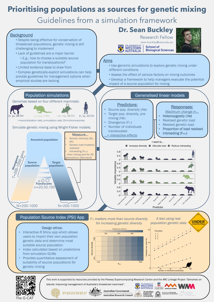 This was the topic of my own short presentation and research poster. I’m aiming to use population simulations to generate some standardised guidelines around genetic mixing. For example, many conservation managers are often faced with the challenging task of deciding where to source individuals to mix into a threatened population: many of these might themselves be small and isolated, which tends to reduce the benefit of genetic mixing. Using population simulations, I wanted to generate statistical models which (somewhat) predict the potential outcome of genetic mixing under different population scenarios. These models will be fed into an online interactive app: managers will be able to upload their own (simple) genetic metrics, calculate a suitability score, and determine which source population might be the best choice for genetic mixing (in a quantitative framework). Although still in development, I’m hoping this app will be usable by early next year. If you want to learn more about my research, check out my poster below: